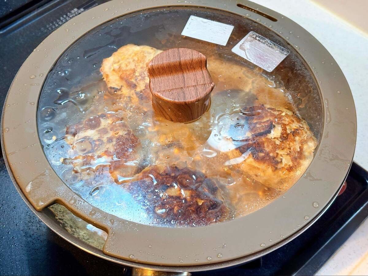 両面に焼き色がついたら一度火を止め、余分な油を拭き取ります。そこに【C】を加えて弱火にし、蓋をして4〜5分煮込みましょう。