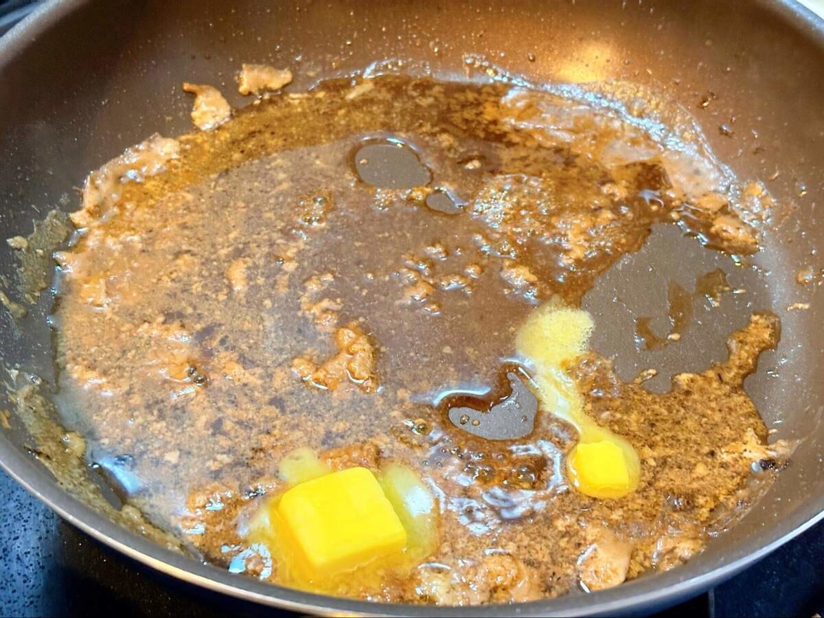 ハンバーグを取り出し、フライパンの煮汁にバター10gを加えて弱火にかけます。水溶き片栗粉を少し加え、とろみを付けたらハンバーグソースの出来上がり。