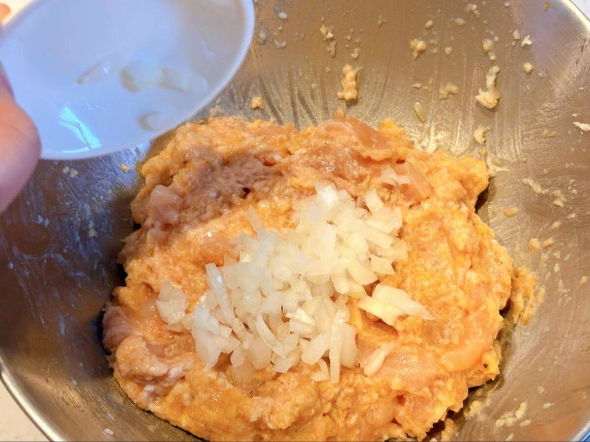 ①の玉ねぎを加えたら、さっくりと混ぜ合わせましょう。玉ねぎを練りすぎると水分が出てしまうので、混ぜる程度で大丈夫です。