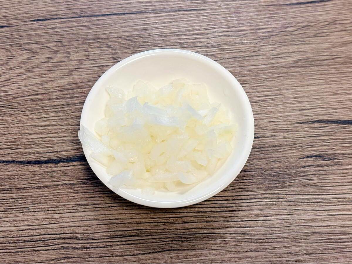 玉ねぎはみじん切りにします。玉ねぎが小さい時は、薄切りにしてからみじん切りにすると、刻みやすくなりますよ