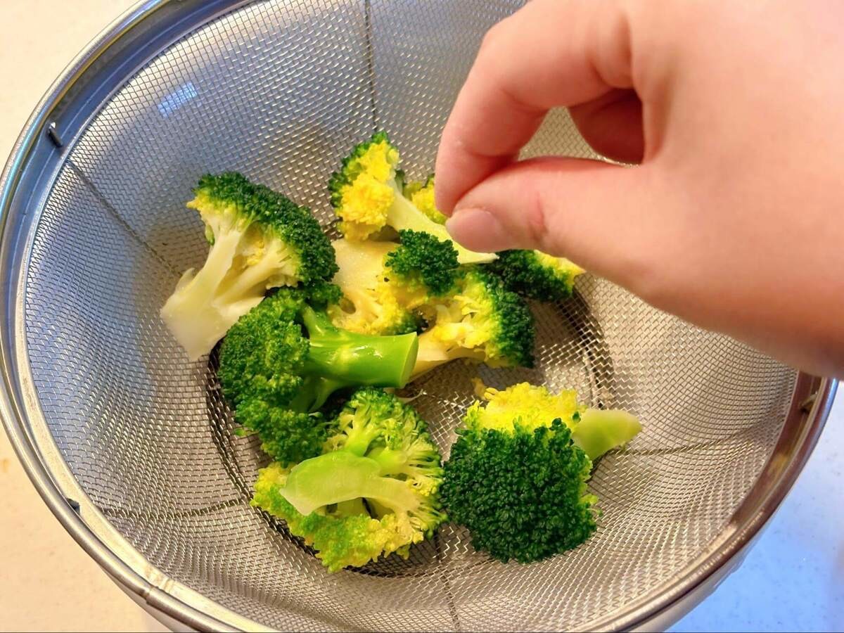 ブロッコリーをザルに上げたら、塩少々をふっておきます。