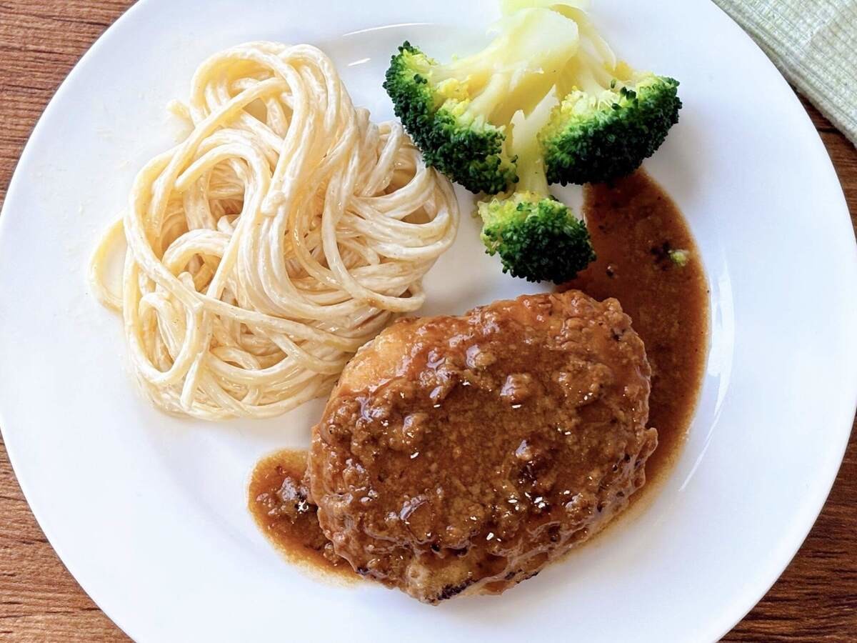 器にスパゲッティとブロッコリー、ハンバーグを盛り付け、仕上げにソースをかけたら完成です。