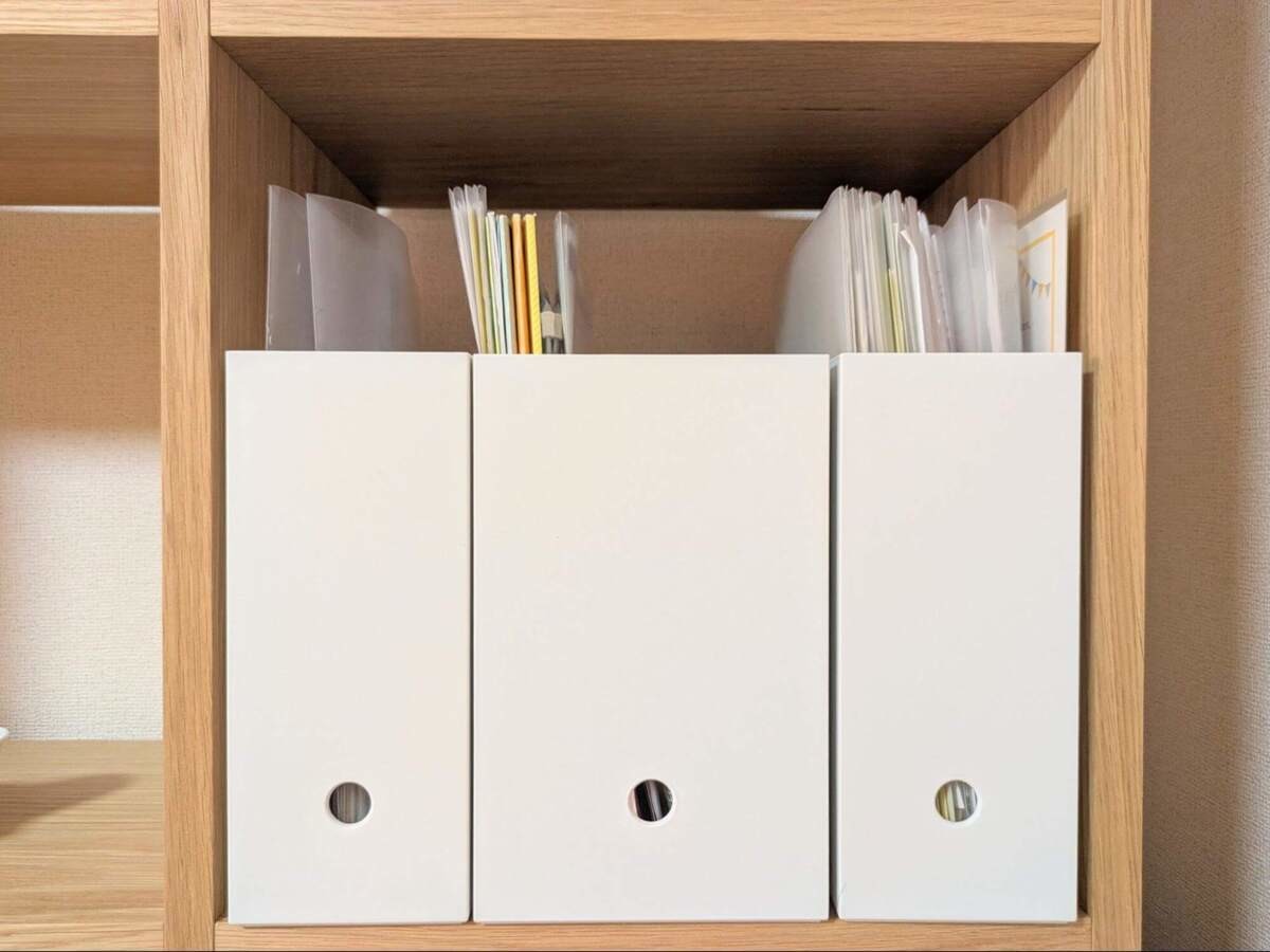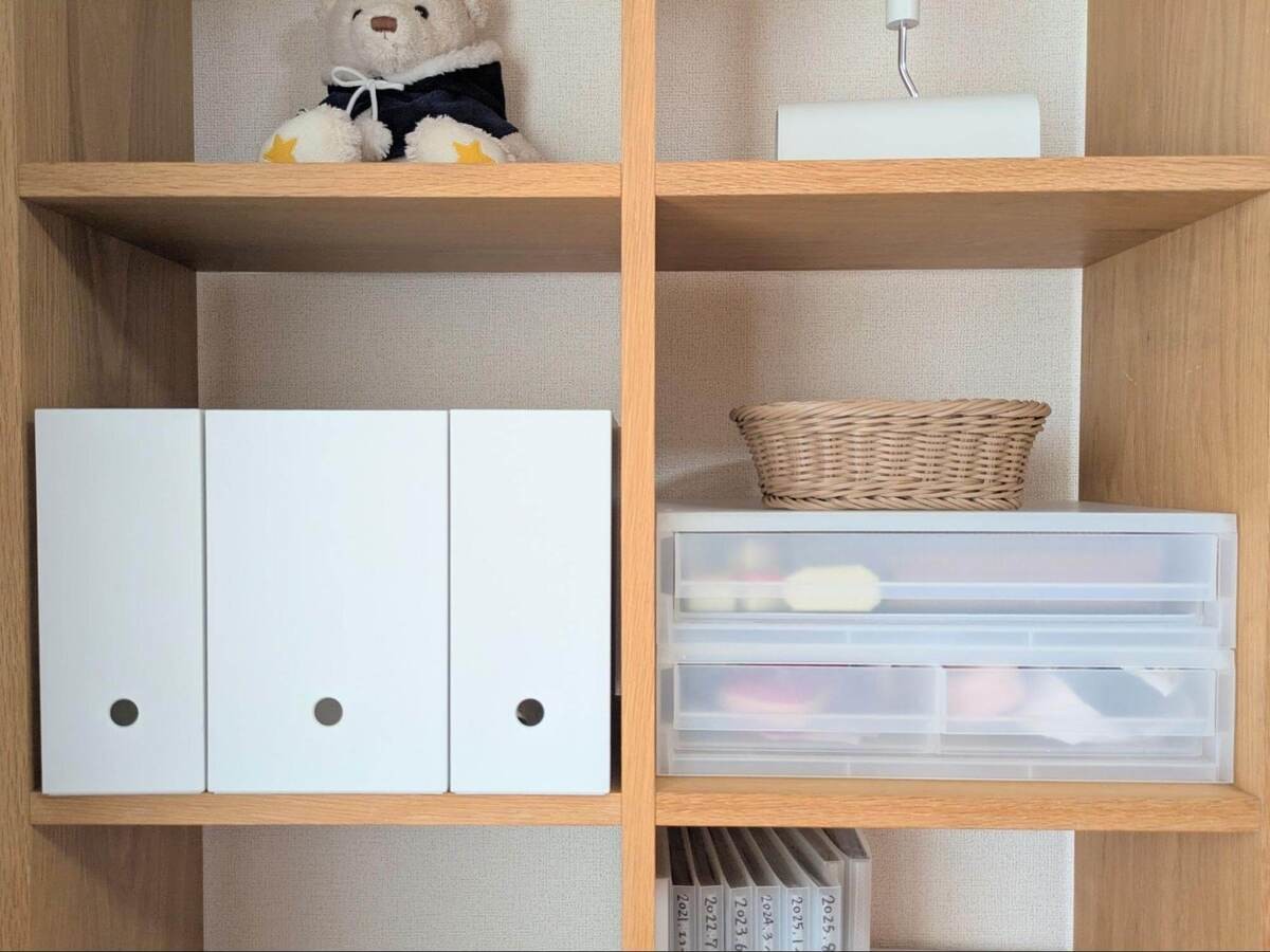 書類はファイルボックス、小物は小物収納ケース、で役割分担すると整いやすいです。