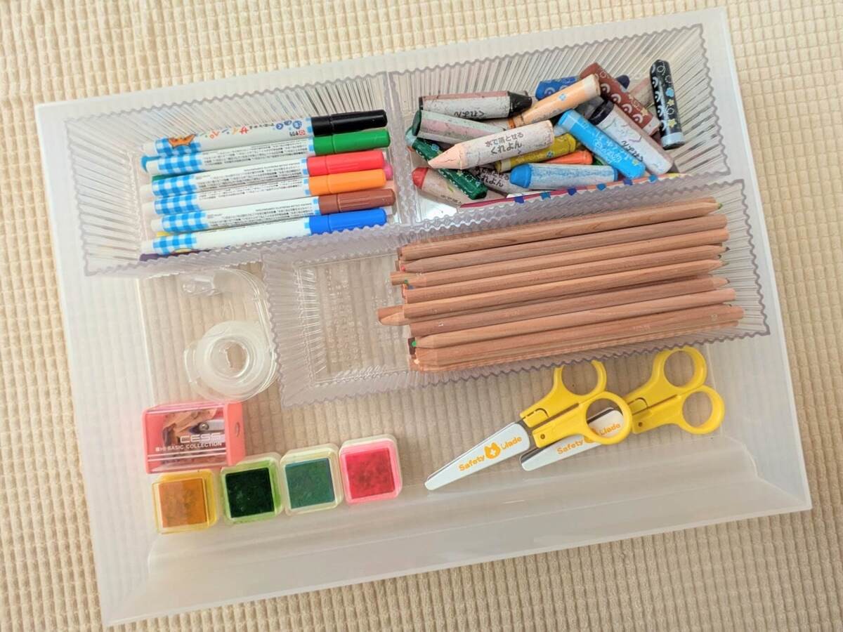 わが家ではワイドタイプは仕切りをして、子どもたちの文房具を収納しています。お絵描きしたいときはこのままテーブルの上に持っていけるので便利です。