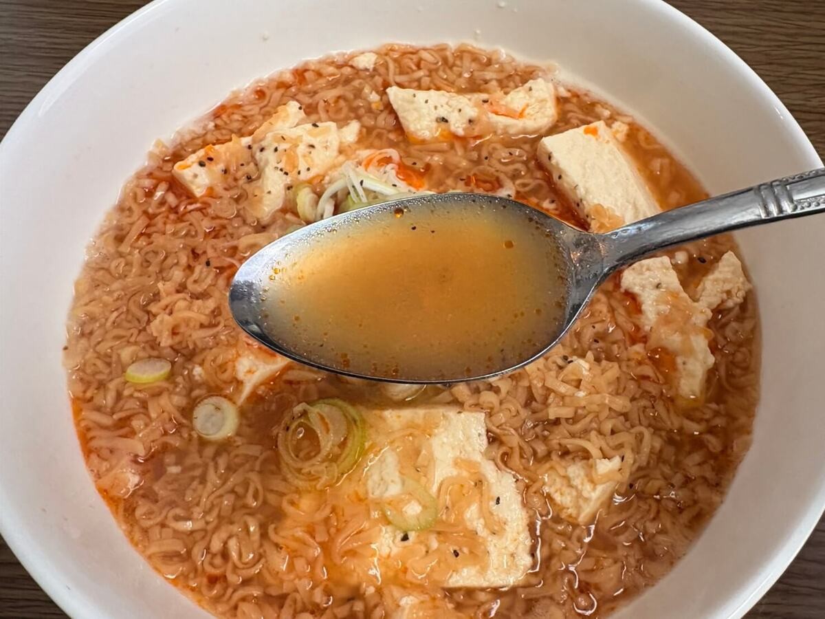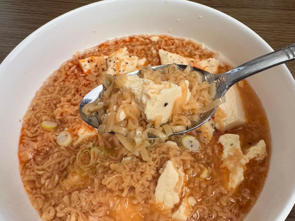 麺にも味がついているので、豆腐と一緒に食べると、チキンラーメン特有のジャンキーな味付けも楽しめます。