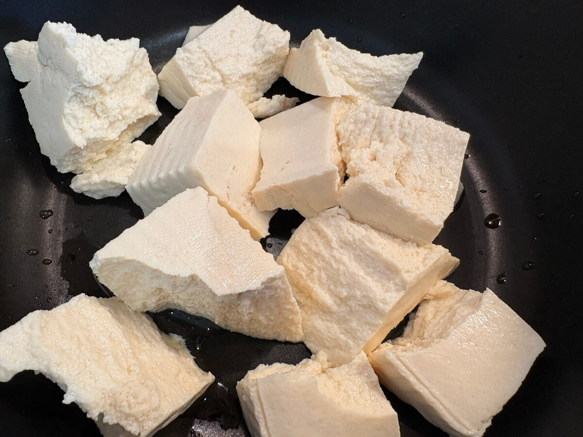 まず、豆腐を手でちぎって鍋(またはフライパン)に入れます。