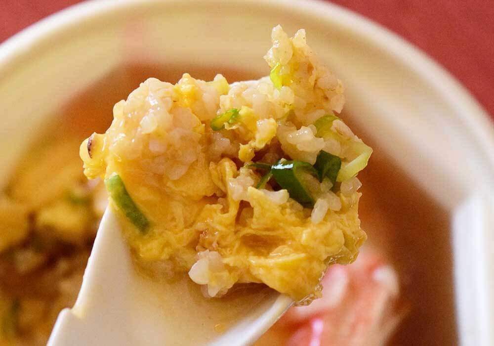 たまごは、ふわっと軽い口あたりで、風味豊かなネギが混ざっています。香り高い焦がしネギオイルをまとったパラっとした炒飯と重なり合い、そこにとろみのある醤油ベースのあんが絡み合います。