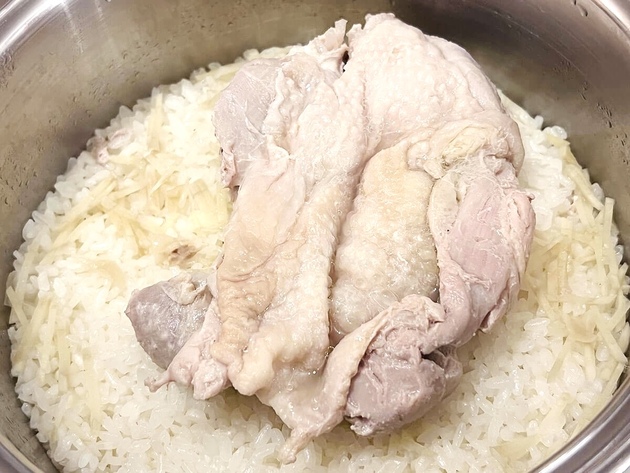 蒸し鶏を取り出して、食べやすい大きさに切り、ご飯は塩と黒こしょう(各適宜)で味を調えます。