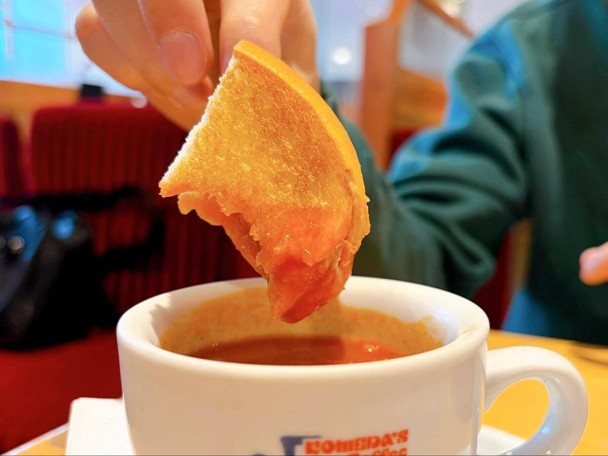 コメダの食パンは半分でも決して小さくないのにスープに浸す、交互に食べる、ペーストを塗るなどバリエーションを試しているうちに気づけば完食。