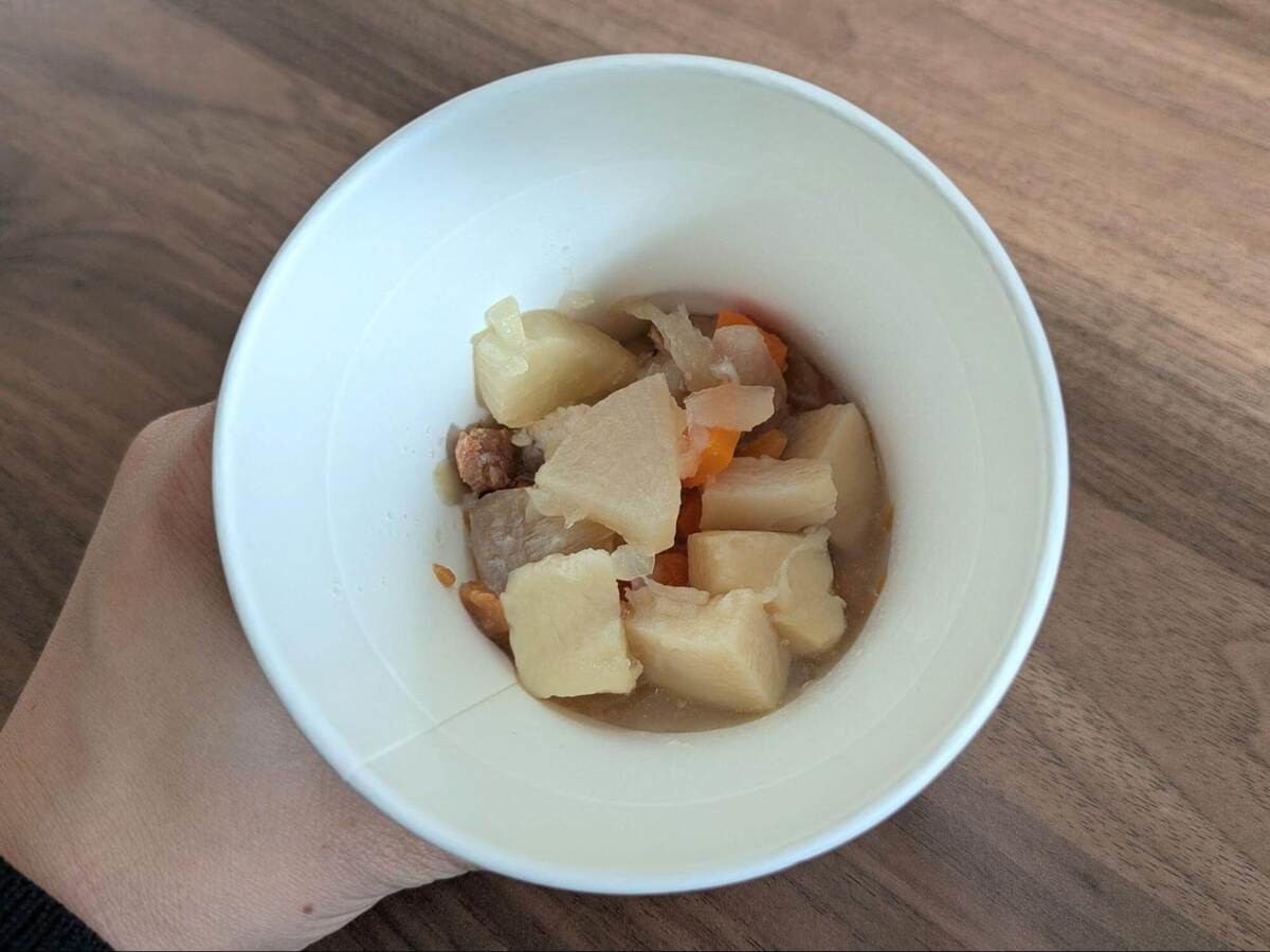 レトルトの汁物といえば、調理みそと乾燥野菜を想像していたので、中身を出して具材の大きさに驚きました。