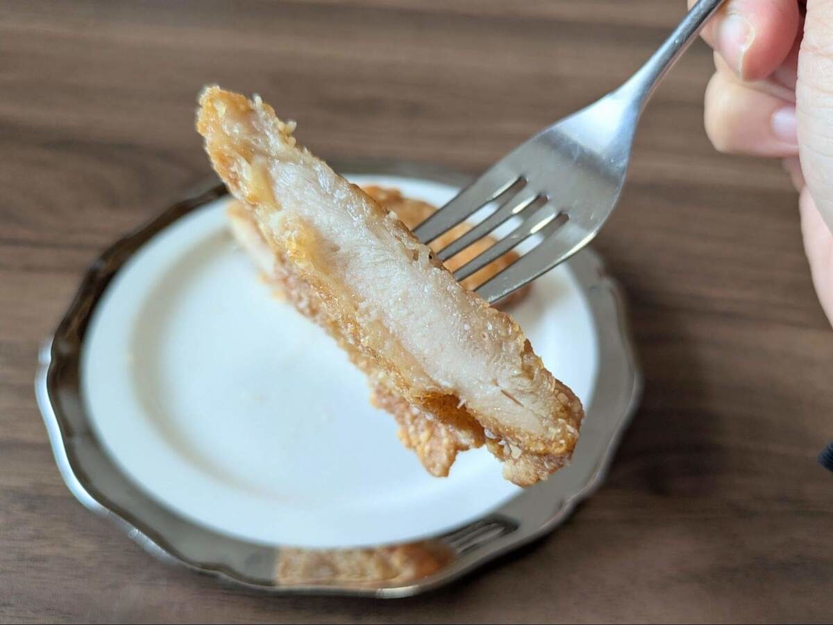 1口食べてみると、衣がザクザクしていて歯ごたえが良く、かむほどにじゅわ〜っと旨みが出てきてジューシー。