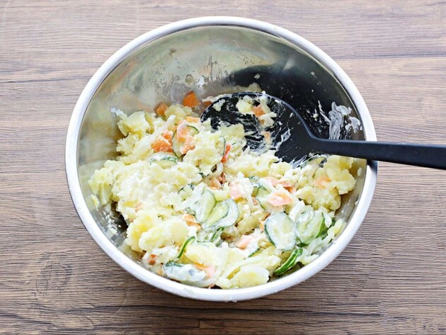 粗熱が取れたらマヨネーズや具材を和え、食べるまで時間があく場合はすぐ冷蔵庫に入れてくださいね。