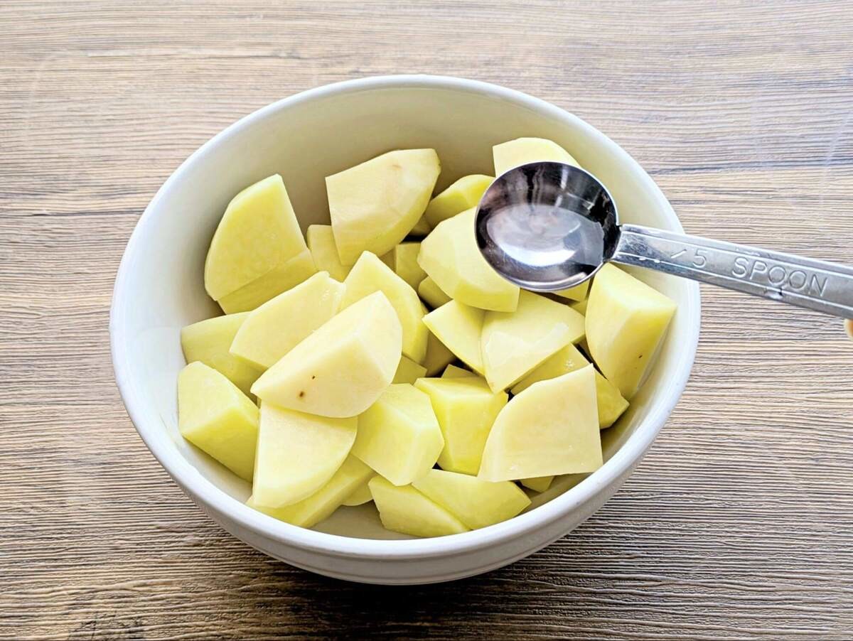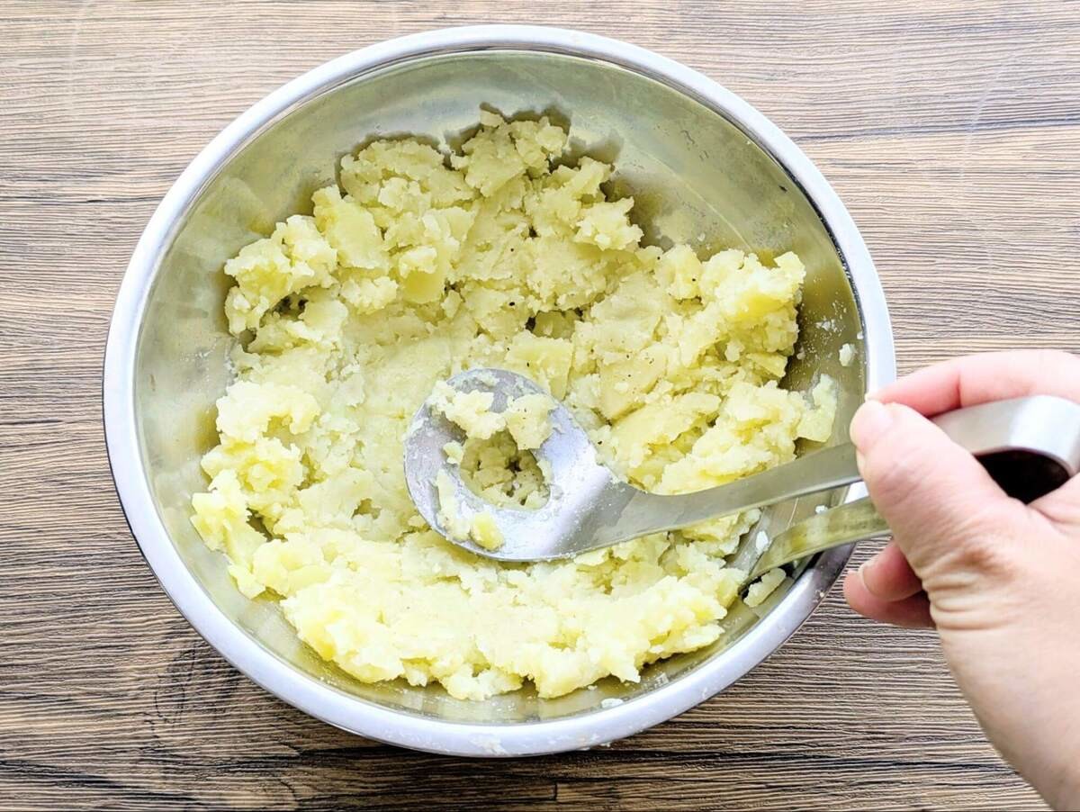 加熱後のじゃがいもは熱いうちに潰して、塩こしょうやお酢などの下味をつけましょう。