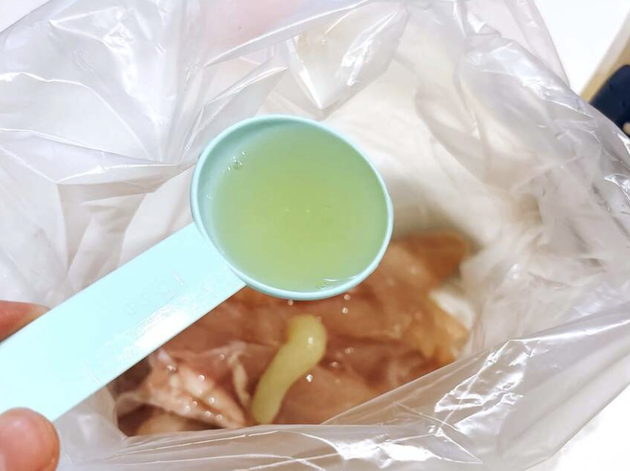 ※今回は、1枚400gの鶏むね肉をカットして使いました。にんにくはチューブ調味料で代用しています。