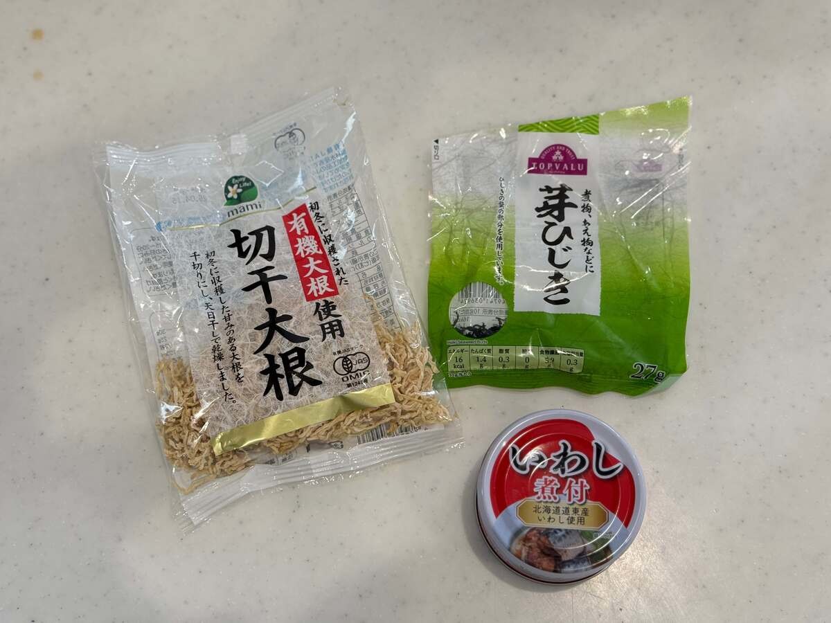 わが家でヘビロテしているのが切り干し大根。水で戻すだけで食べられるので、サラダに混ぜて満足度を上げたり、味噌汁の具材にしたりしています。