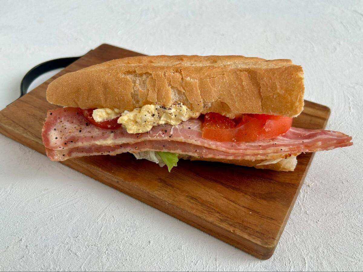 ベーコンの塩味と濃厚な卵サラダが主役になっていて、フレッシュなトマトは引き立て役に。レタスのシャキシャキ感がアクセントになっています。