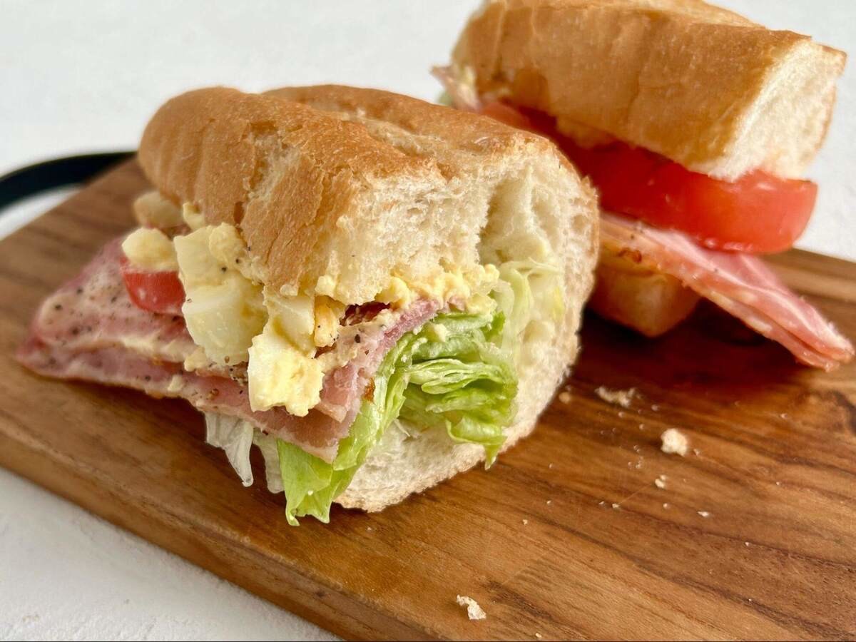ベーコンとレタス、トマト、卵サラダのサンドイッチ。