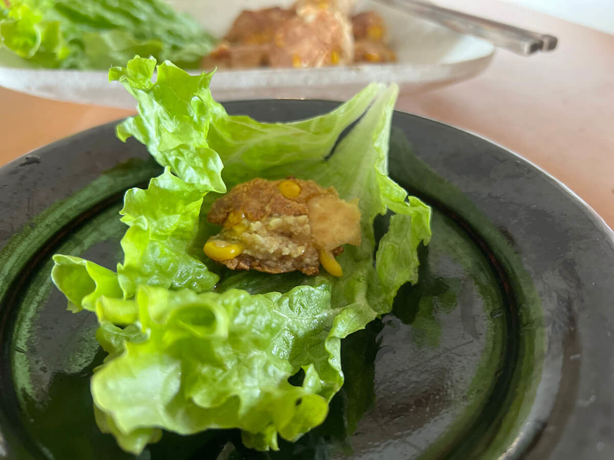 豆腐と魚、と思うととてもヘルシー感のあるものを、生野菜に包んでむしゃむしゃいただく満足感たるや。悪くないわー、これ、気に入ったわーと思いつつ、1人分、4個ペロリと食べてしまいました。
