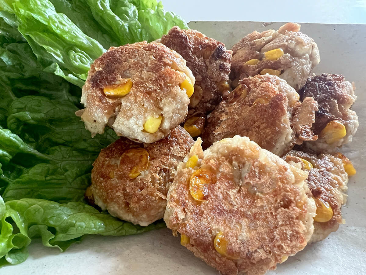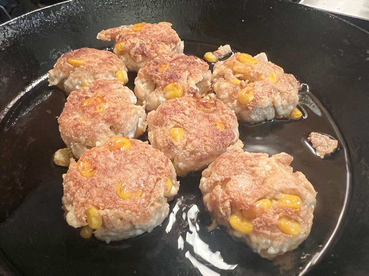 フライパンにサラダ油を熱してタネを並べます。中火くらいで焼いてこんがり焼けたら裏返し、揚げ焼きにして取り出しましょう。