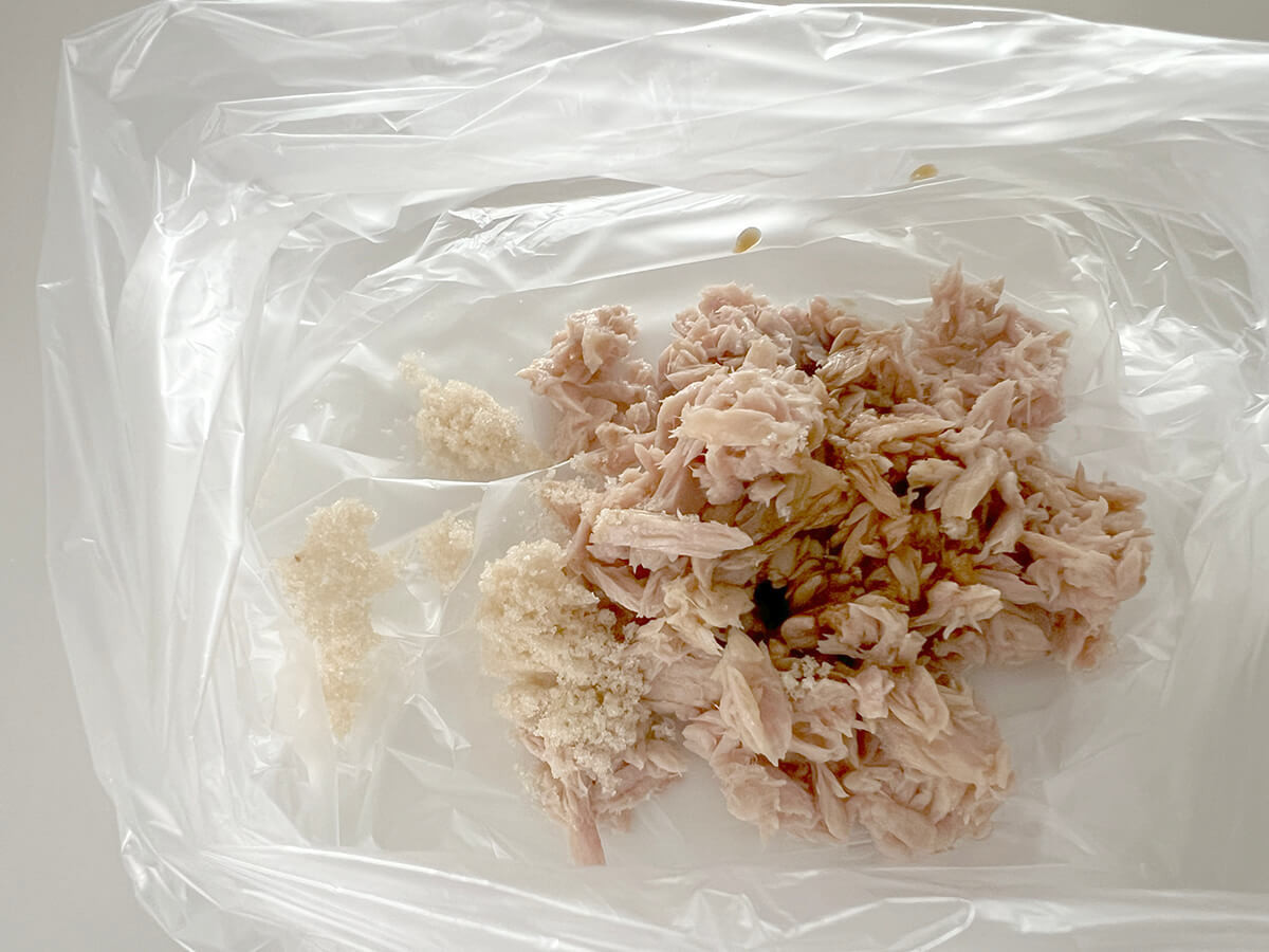 ビニール袋にツナの油をきって入れ、砂糖、しょうゆを加えて混ぜ合わせます。