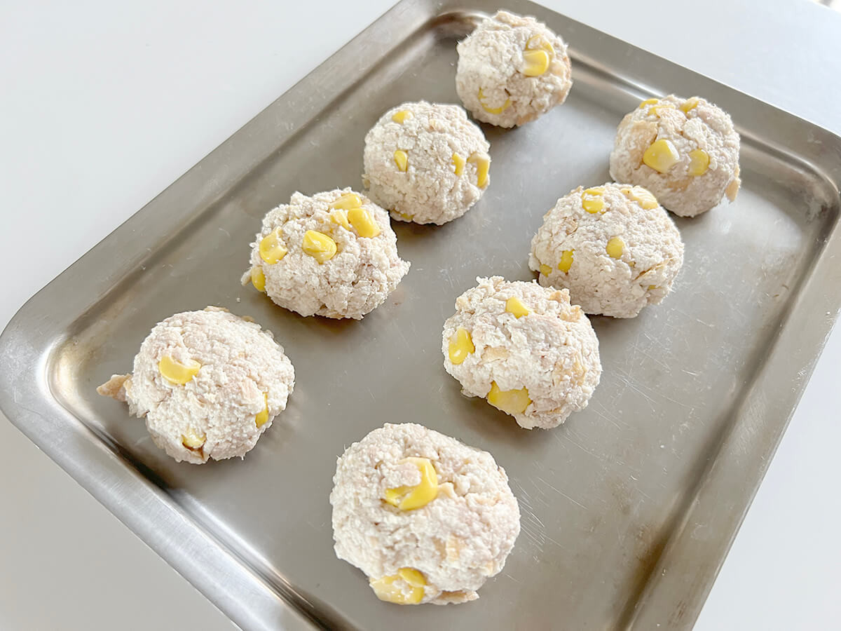 8個に平たく丸めましょう。いわゆるナゲットの感じになるようにイメージしました。
