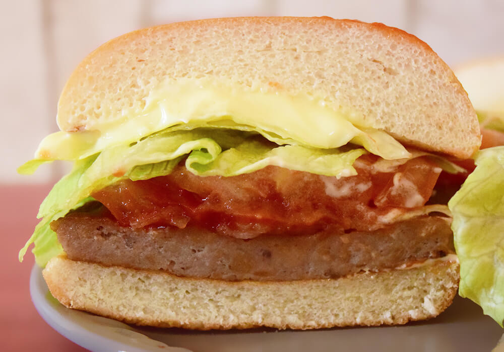 ハンバーガーパティにトマト、レタス、オニオンスライスをのせケチャップとカロリーハーフマヨネーズタイプで味付けしている一品です。ドリンク付きであれば540円(税込)~。お持ち帰りもできます。