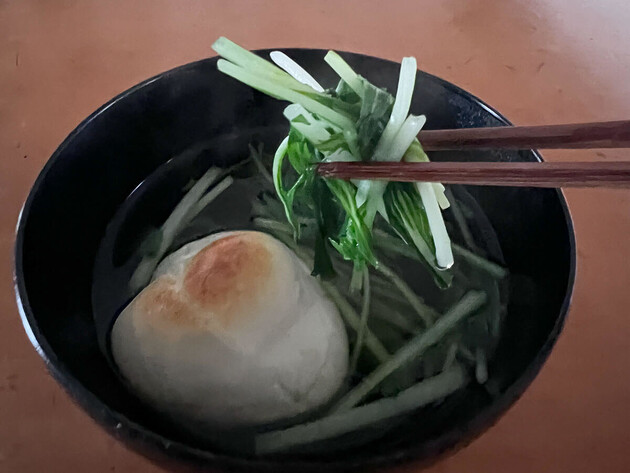 焦げ目をつけて丸餅を焼き、器に入れてだしを注ぎ、完成です。