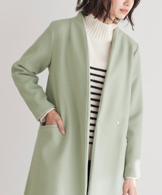 ③ノーカラーで直線的な襟元が特徴のコート