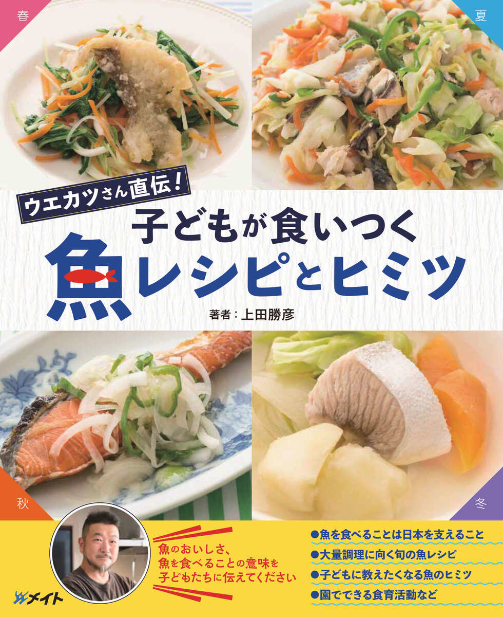 「魚の伝道師」と呼ばれるウエカツこと上田勝彦さんが、幼保育園向けの食育誌に連載した、子どもたちが喜んで食べる魚料理のレシピの数々を1冊にまとめた『ウエカツさん直伝! 子どもが食いつく 魚レシピとヒミツ』。