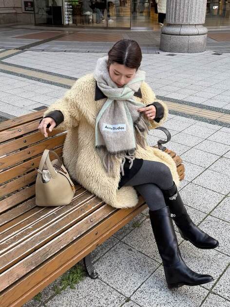 ショート丈ボトムに抵抗がある人こそ試してほしい、リブタイツとロングブーツの組み合わせ。脚のラインをやさしく包み込みつつ、視線を縦に流してすらり見えを後押しします。足元に重さを出すことで、ミニ丈でも落ち着いた印象にまとまるのが嬉しいポイント。