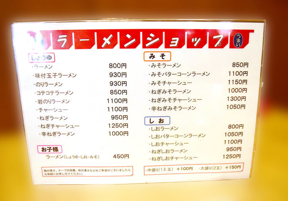 メニューは「しょうゆ」「みそ」「しお」ラーメン、お子様ラーメンもあります。価格帯は山岡家や魁力屋と同じくらいなんですね。