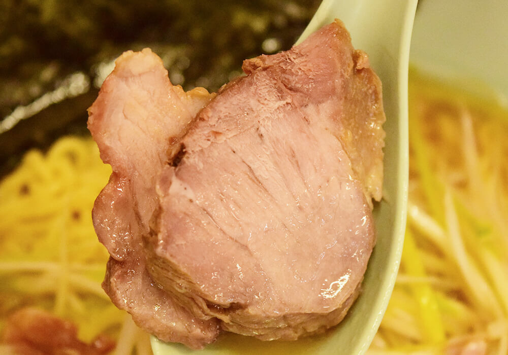 チャーシューはほどよい厚みがあり、脂身は控えめ。箸でほぐれるほどやわらかな食感です。味付けは醤油ベースで、雰囲気としては、じっくり煮込まれた煮豚に近い印象。そのままでも十分おいしいですが、ごはんの上にのせて食べてもいいかもしれません。
