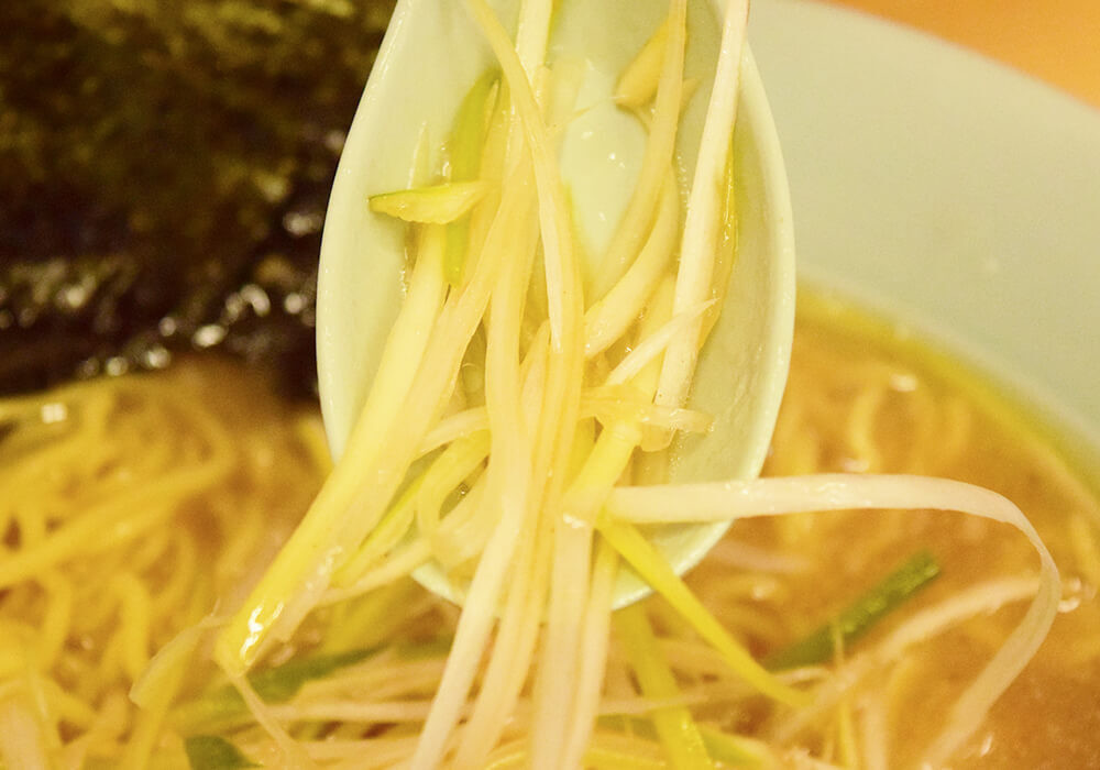 千切りにされたねぎは、シャキシャキとした心地よい食感。ごま油と醤油ダレで和えられているため、ねぎ特有の苦みはひかえめに感じられます。そのねぎがスープに溶け出していくことで、香ばしさとほどよい辛味が加わり、スープの旨味がさらに引き立っていきます。