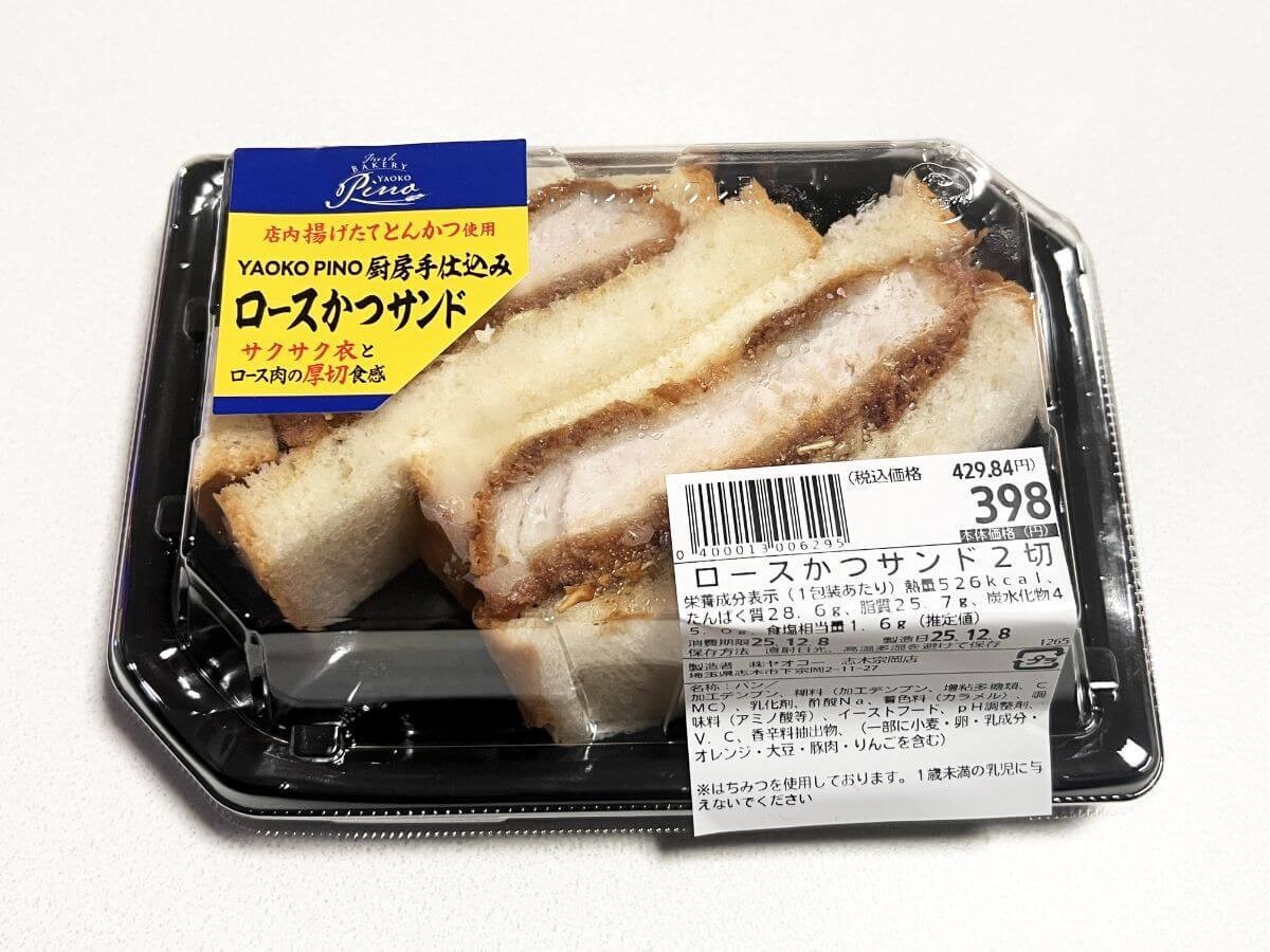 ヤオコーのベーカリー「ピノ」で販売されている、食べ応えのあるカツサンドです。お肉がしっかり厚くて、ひと口食べると思わずニヤっとしてしまうほどの食べ応えです。