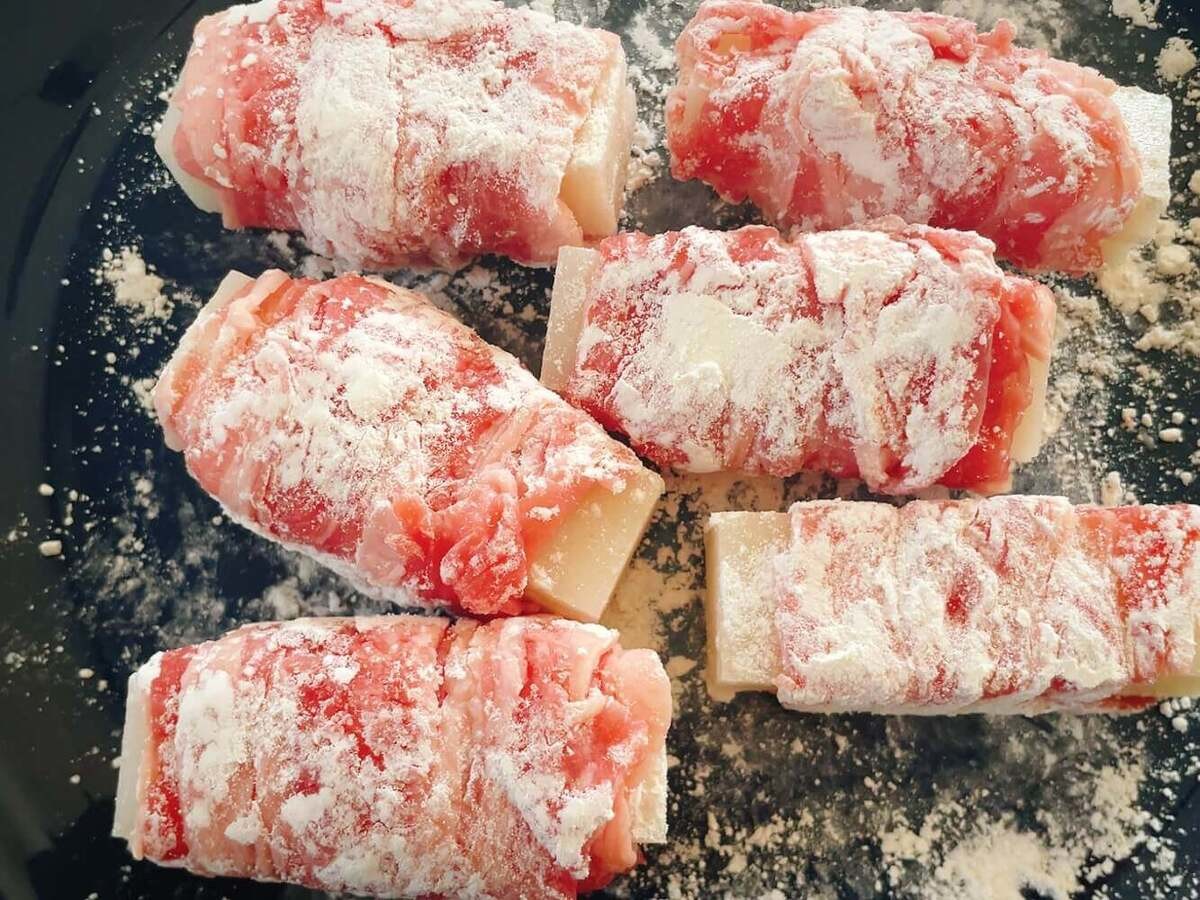 巻き終わったら、牛肉の表面に薄力粉を薄くまぶします。