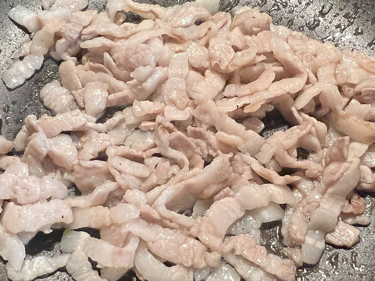 フライパンは中火でしっかり熱します。生の豚肉を先に炒めるのですが、脂は豚肉から出てくるから油をひかなくてもいいそうです。