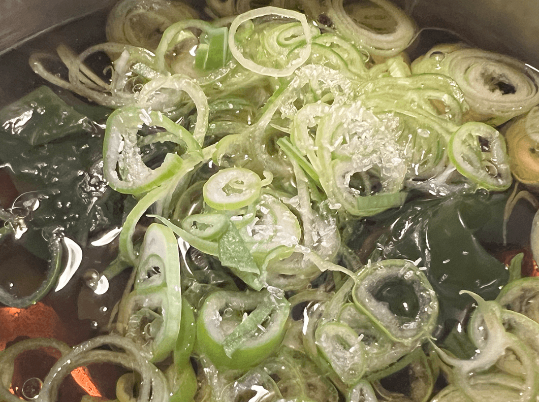 小鍋に【おまけスープ】の【C】の材料を全て合わせて火にかけ、長ねぎの青い部分とわかめを加えて、ひと煮立ちさせましょう。