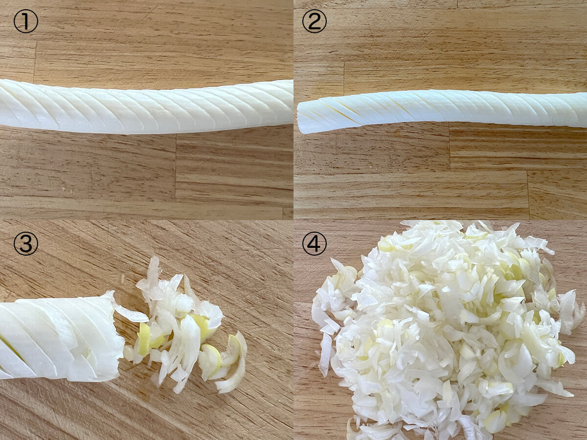 ①片面に斜めに切れ込みを入れ、②反対側にも同様に切れ込みを入れ、③それを端から切っていくと、④いい感じのみじん切りになる、と教えていただきました。