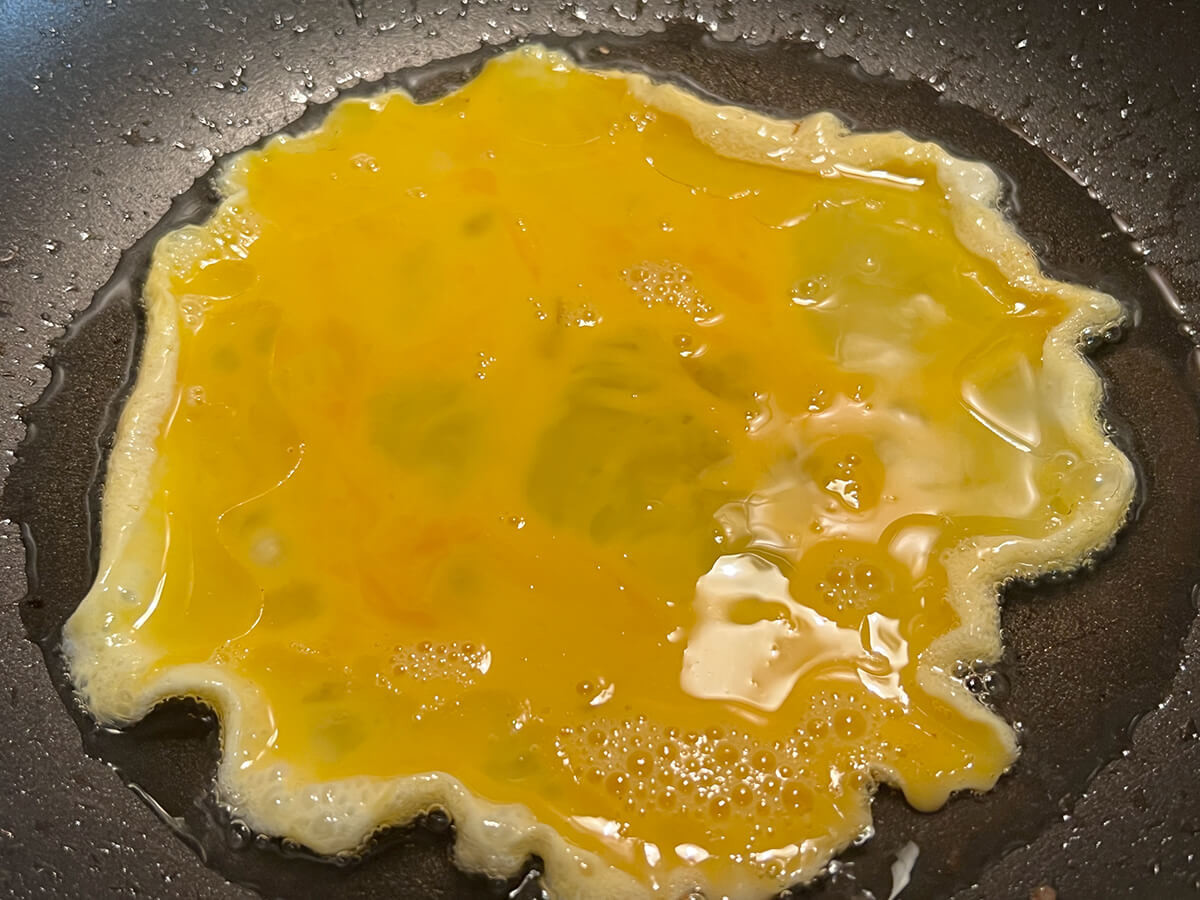 同じフライパンにサラダ油(大さじ2)を足し、中火にかけて温めます。しっかり油が熱せられたら溶き卵を入れましょう。