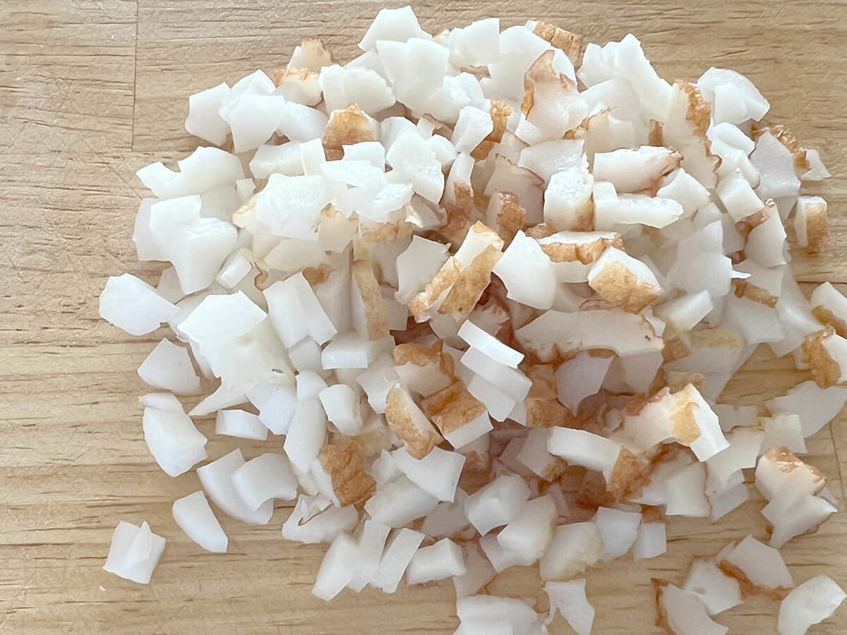 ちくわは1本を縦に6等分くらいにしてから細かく刻みます。
