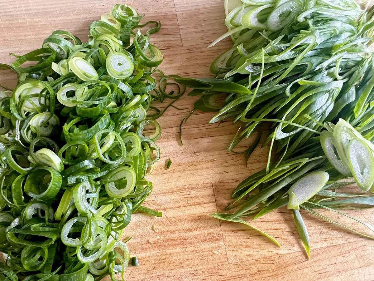 九条ねぎは、1本は小口切りに、1本は斜め薄切りにします。