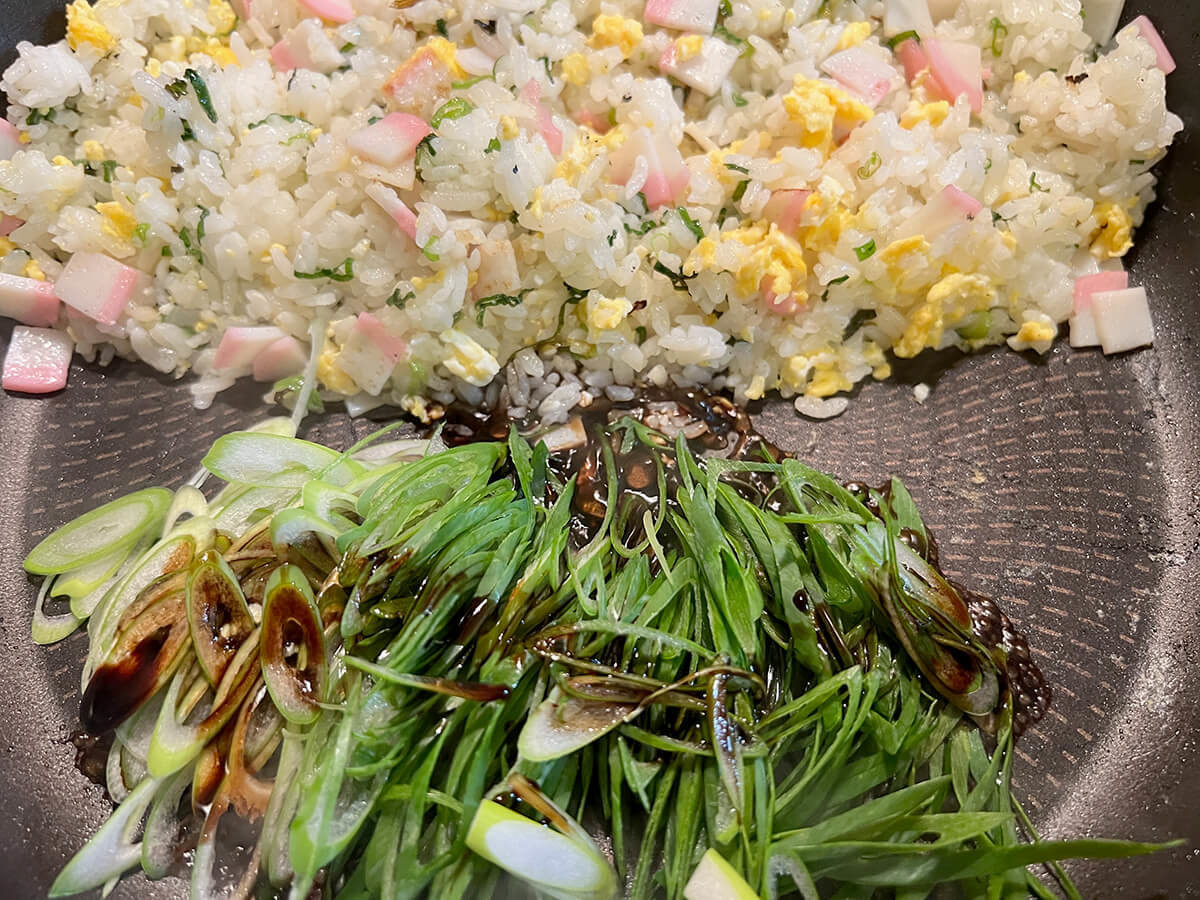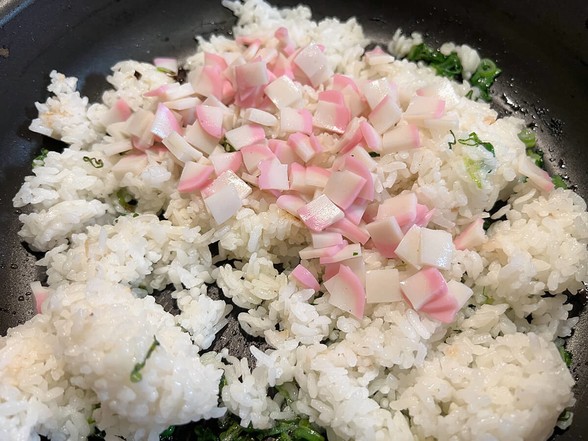 ねぎから水分が抜けて油に香りが移ったら、ご飯とかまぼこを加えて油をなじませます。