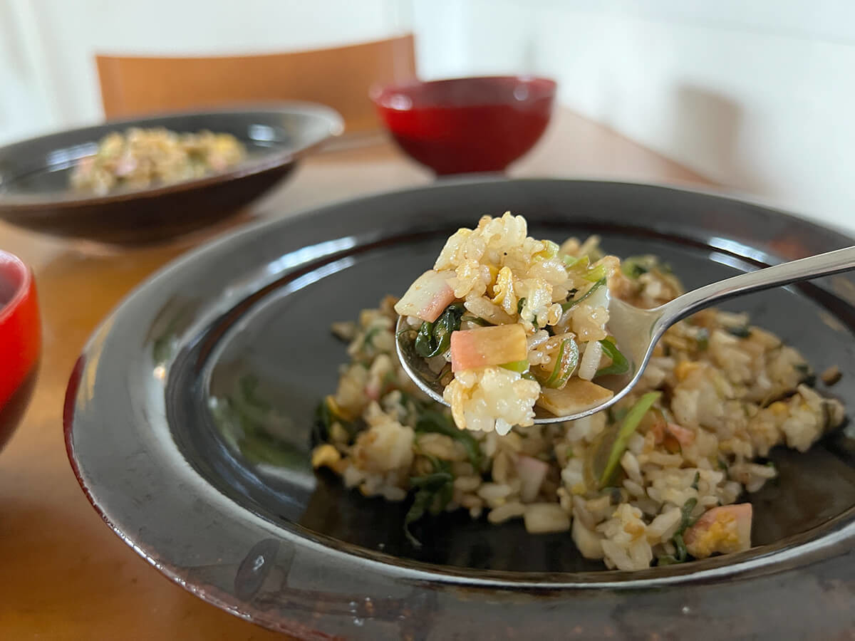 小口切りにしたねぎはじっくり炒めて最初に、斜め切りにしたねぎは焦がししょうゆを絡めて最後に使うという2段階の使用法で、九条ねぎの魅力を盛り込んだ焼き飯です。使い方、すごく勉強になりました。