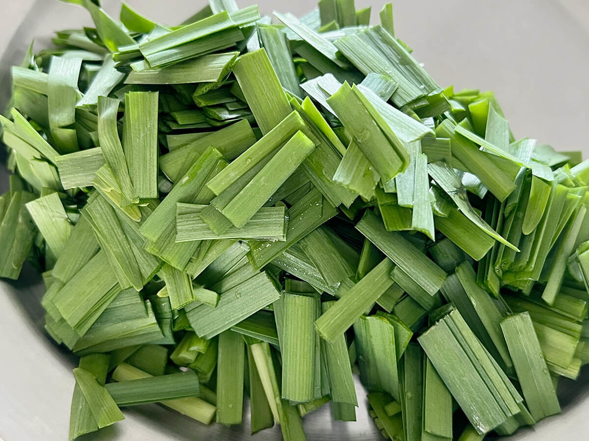 にらは根元を2~3mm切り落とし、2.5cm長さに切ります。