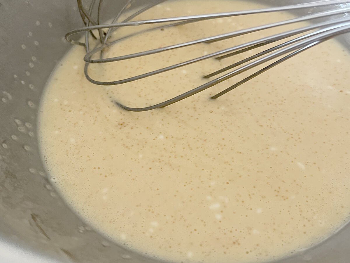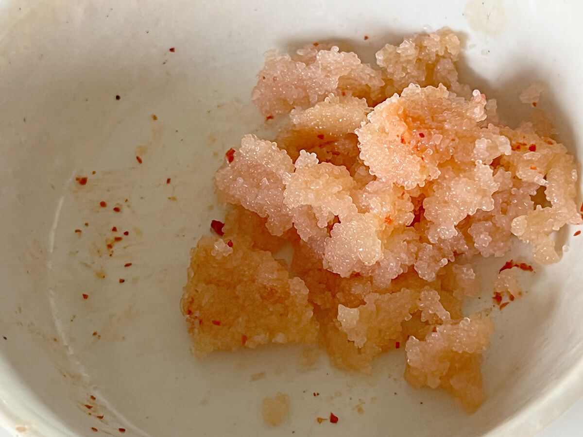 【A】をよく混ぜて生地をつくります。そこに明太子を加えて混ぜましょう。小さいプチプチが入っているの見えますでしょうか?ついでにちょっとダマになっちゃってるのも見えますね(汗)。