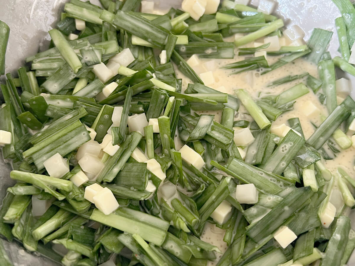 にらとチーズ、もちを加えて混ぜ合わせます。