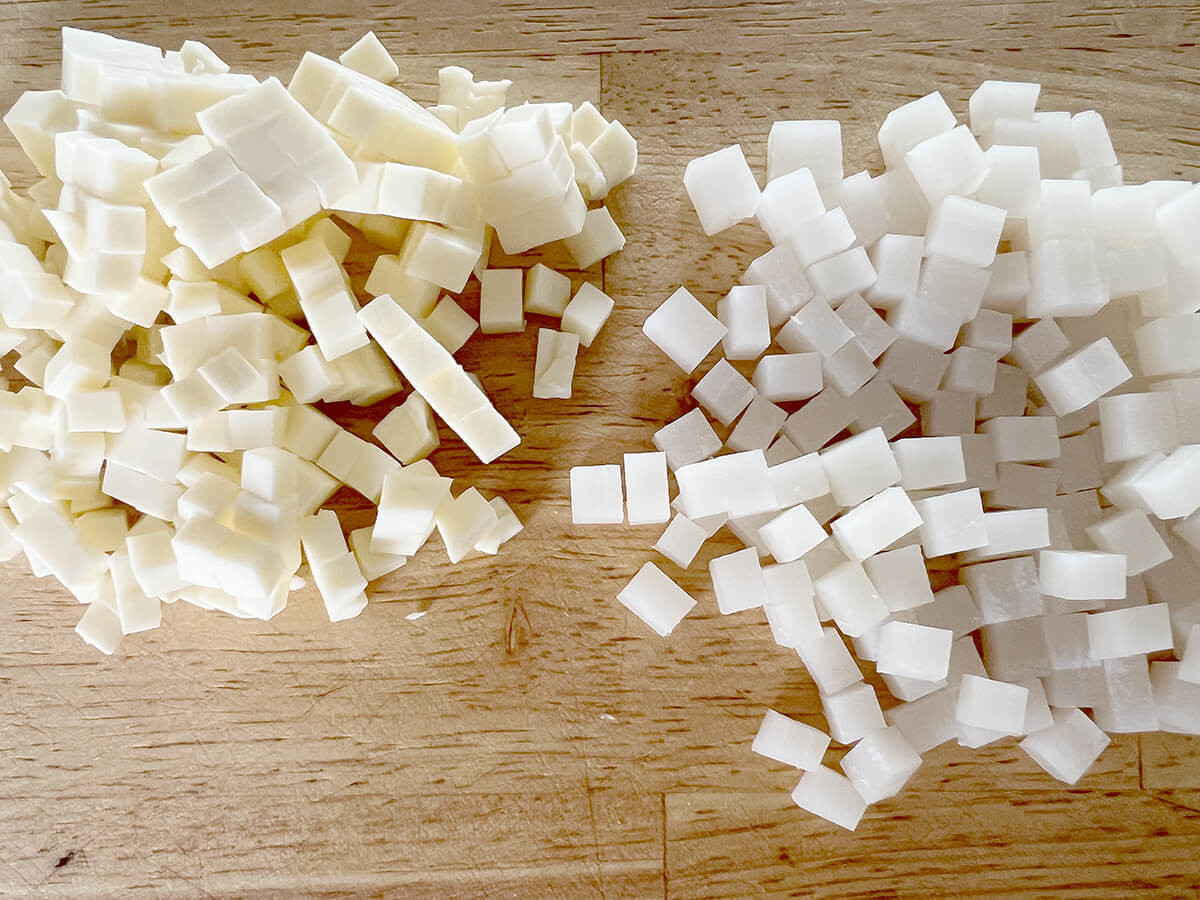 もちが包丁にくっついてくるので、ちょっと切りにくいですが、丁寧にひと口大に切り、盛り合わせたら完成です。たれを添えていただきます。超わくわく。