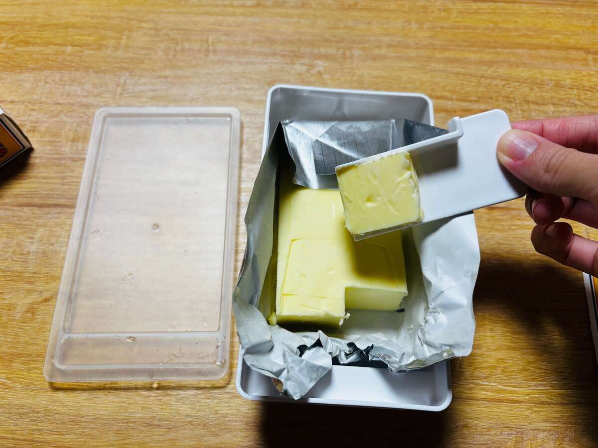 冷蔵庫から出してすぐのバターでも、軽い力でカットすることができ、もちろん、カッターにバターがくっついてしまうこともありません。