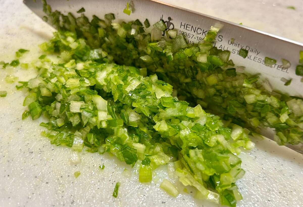 長ネギの青い葉の部分も、同じようにみじん切りにします。