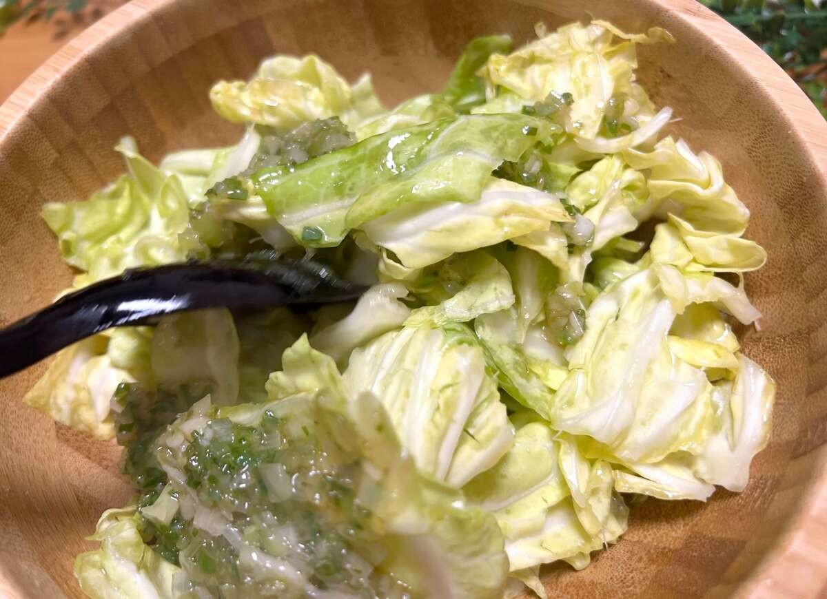 ④のネギ塩ダレを半量ほどキャベツと混ぜ合わせたら、器に盛り付けます。